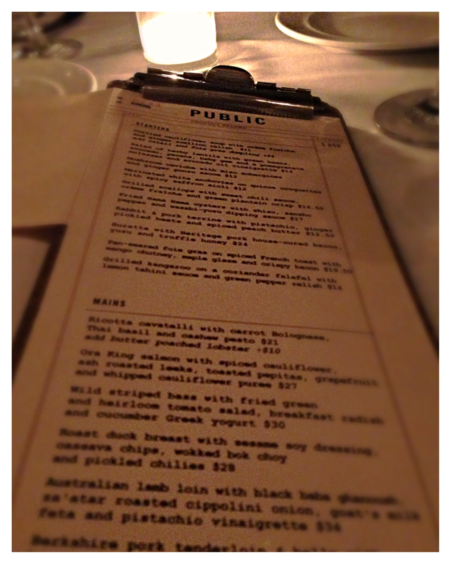 Last night, I went to PUBLIC, one of the restaurants on my Michelin Guide List. PUBLIC has been here for 10 years, I’ve lived here for 7, and, yes, this was my first time here. I guess that’s the beauty of living in a city with thousands of restaurants!