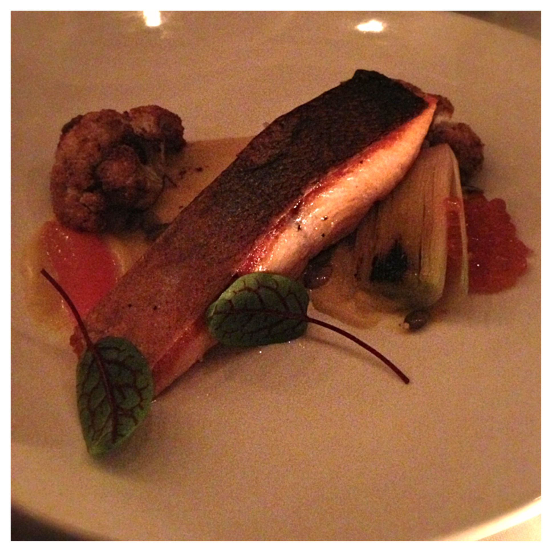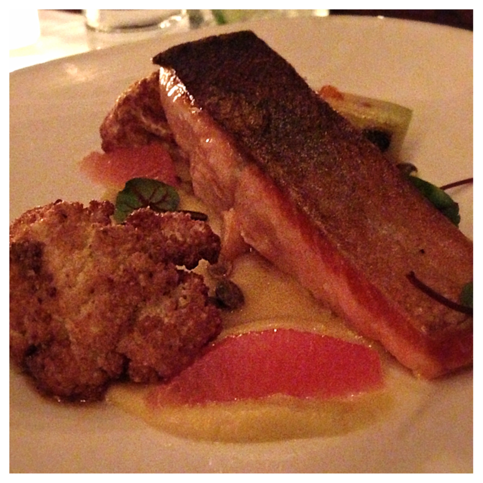 Finally, my entree arrived. I ordered the Ora King Salmon with spiced cauliflower, ash roasted leeks, toasted pepitas, grapefruit and whipped cauliflower purée. Ok, I’m about to sound like a jerk, but, the first thing i noticed was that my plate was hot…which, gets me nervous sometimes because I think it’s been under a heat lamp. The other reason I thought that, was the salmon roe (which I thought was an interesting accompaniment, not necessarily in a good way) were warm and heated. Ever have a heated salmon roe? Don’t. It’s gross. Working past that, I’ll say that the salmon, cooked medium-rare, had great flavor. The cauliflower purée was really nice, creamy and just the right amount of saltiness. The cauliflower pieces were really nice as well, crisp on the outside with a great crumb coating. So, what didn’t really belong (aside from the warm salmon roe)? The slices of grapefruit…that were also warm. Again, I’m not sure that warm grapefruit really has a place anywhere. But, overall, a good dish.