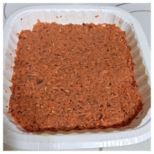 Add the mixture to the sweet potatoes and mix by hand. Then, put the mixture into a greased 9 inch baking dish or tin. Pop that in the oven for about an hour.