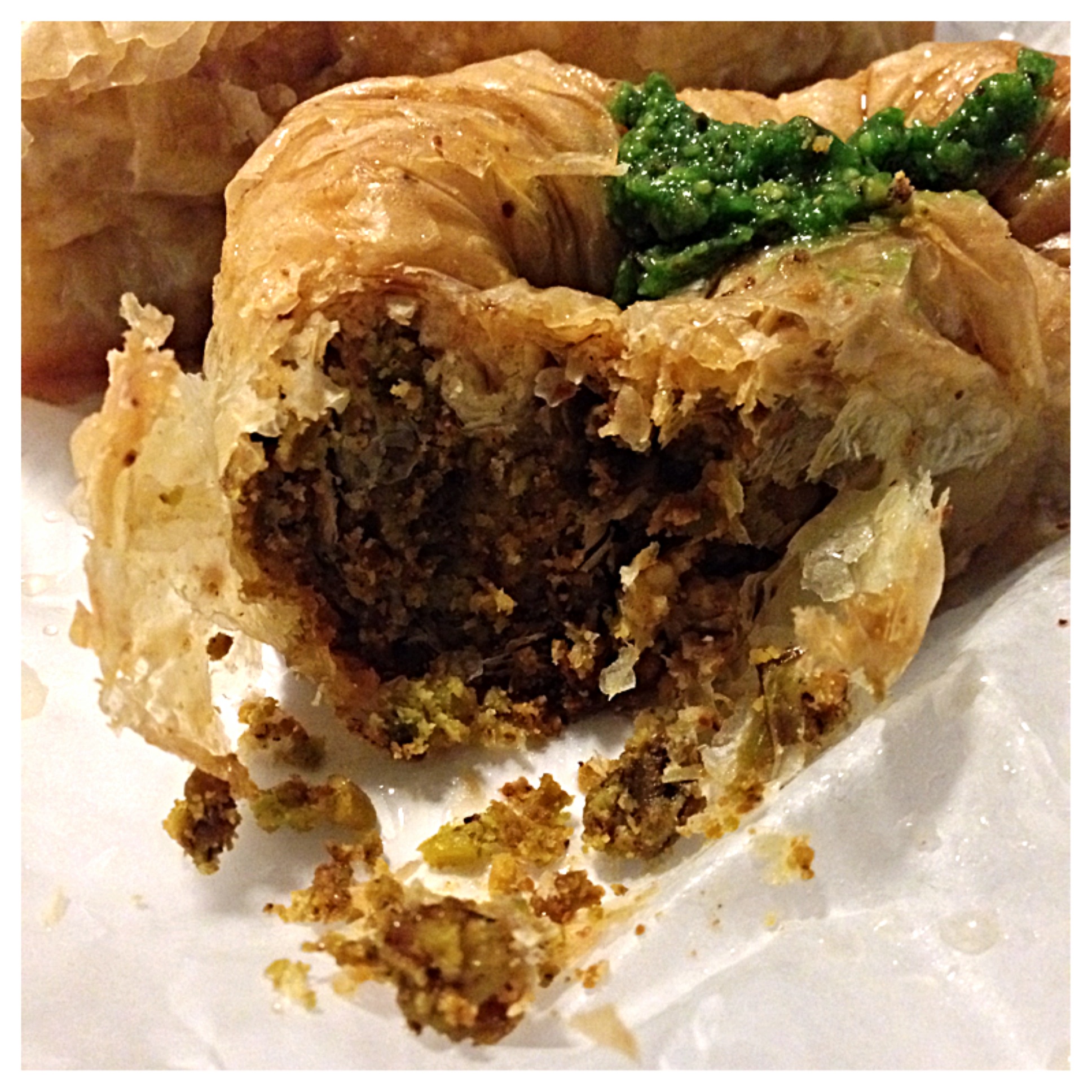 I got two items (because, everything sounded too good to just get one), neither of which were Baklava. I’ve had many Baklavas in my day, and, I figured that an authentic Greek Bakery is where I should be trying new things. First, I tried Afali (fun fact: it means “birds nest”), which has a roll of chopped pistachios surrounded by phyllo and dipped in honey. It tastes just as good as it sounds, maybe better. The honey soaked phyllo is slightly crisp and tender at the same time, covering a mound of chopped pistachios that balance out the sweetness. Then, I got Galaktoboureko, a rich custard wrapped in phyllo. This was awesome too. Again, you have that great sweetness and texture of the phyllo, and then theres a slightly sweet and creamy custard that I would describe as almost tapioca like.