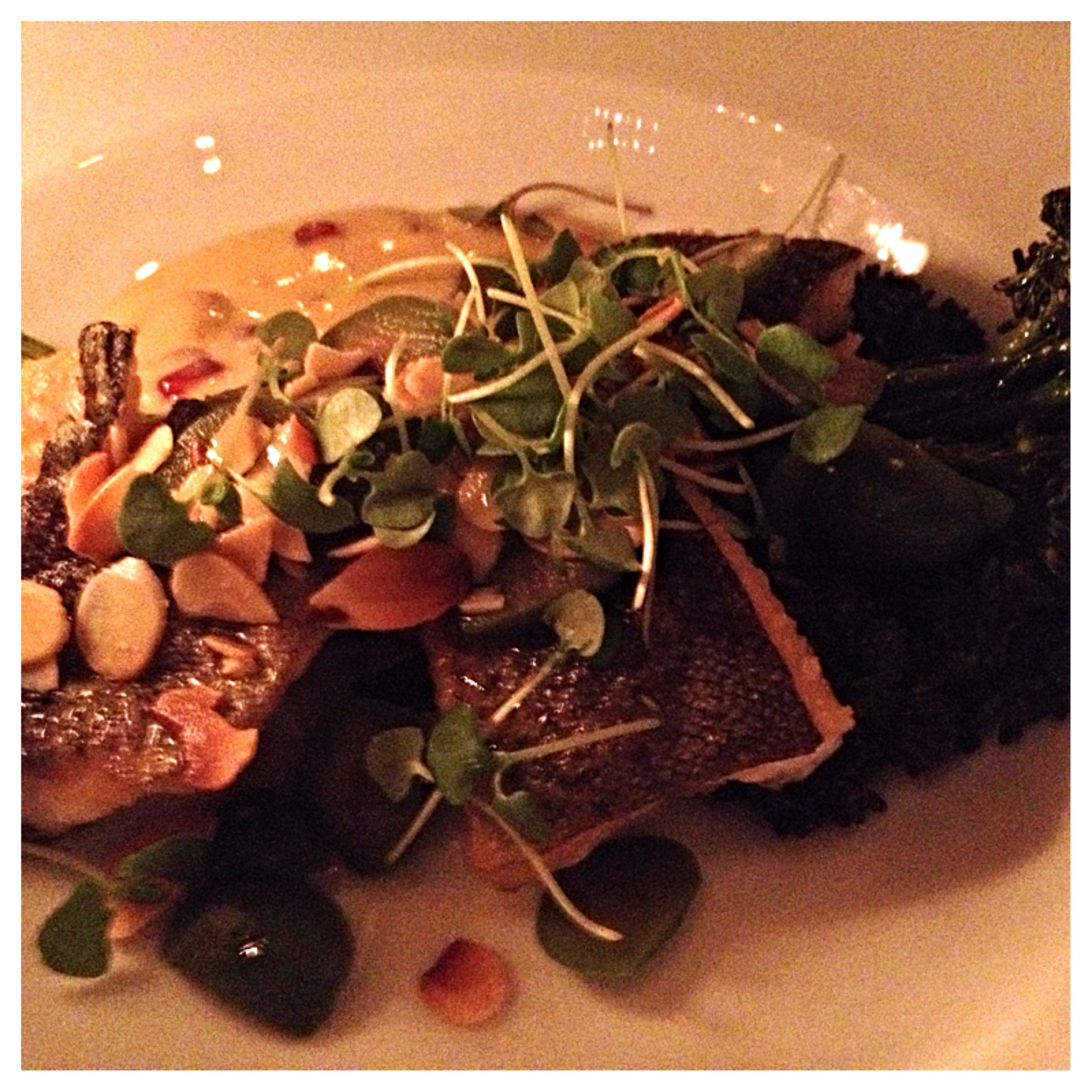 First, I ordered their Fresh Fall Greens (kale, swiss chard, brussels leaves, frisée, harvest fruits and vegetables, horseradish-buttermilk dressing, candied walnuts). Piled up to a little salad heaven, this was a really delightful start. The harvest fruits that evening were apple, pear and quince (a fruit similar in texture to a pear with a very mild flavor). I liked the contrast of flavors from the mild horseradish in the buttermilk dressing to the sweetness of the apples and candied walnuts.