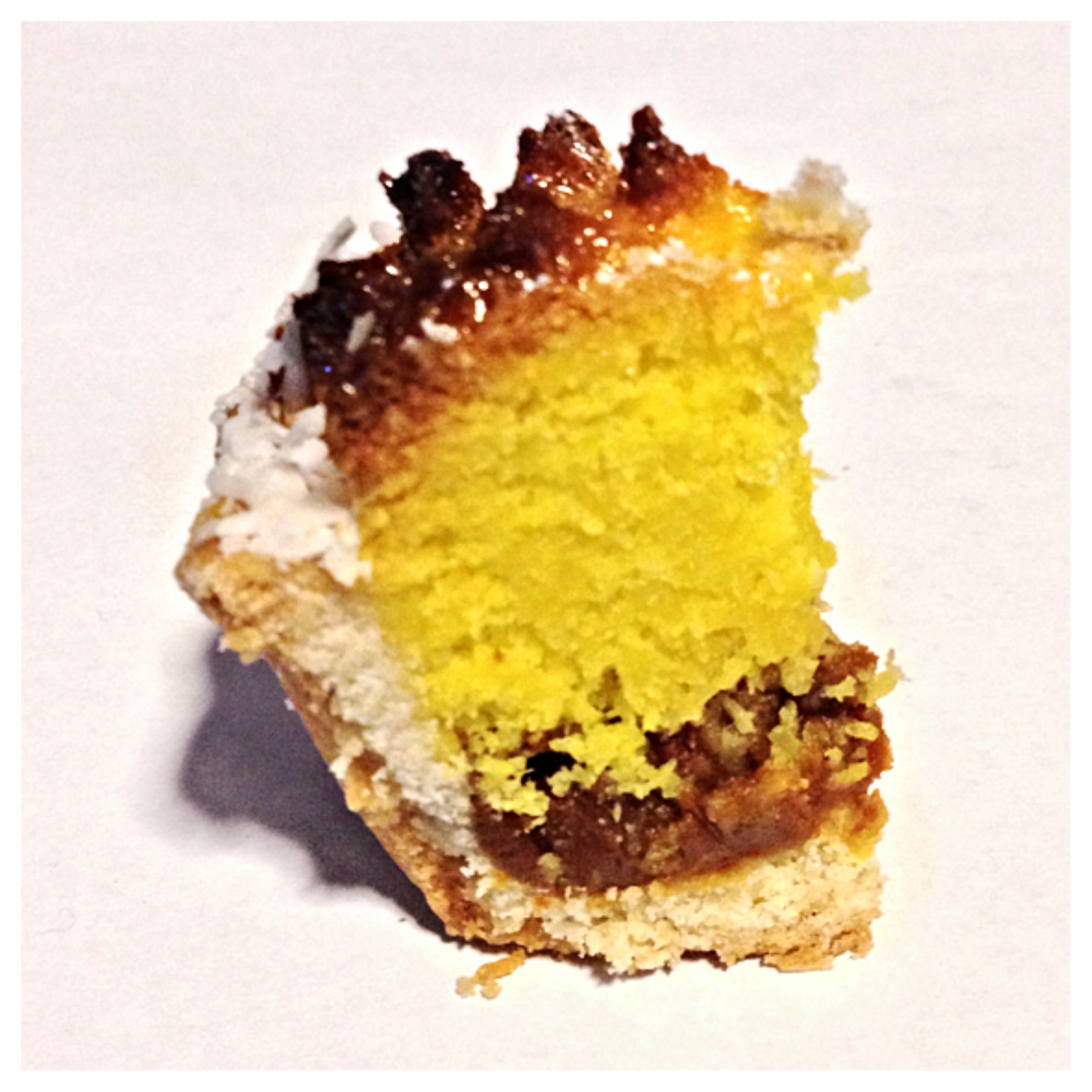 Lastly, I had…well, it didn’t have a proper name in the store, so, I’ll awkwardly attempt to give it a name. Let’s call it a DDL filled coconut pie. This thing was unreal, unlike anything I’ve ever had, and, a bit intimidating. First off, it’s a beast. It’s meant to be more of an individual portion, but the size of my hand (disclaimer: I have kind of small hands) and weighs…a pound? It’s heavy. The pie crust is delicious and flakey. Then, there’s a generous layer of DDL at the bottom of the pie. And then, there’s a dense, thick layer of the coconut that I would compare to the taste and texture of a macaroon (not to be confused with a French macaron).