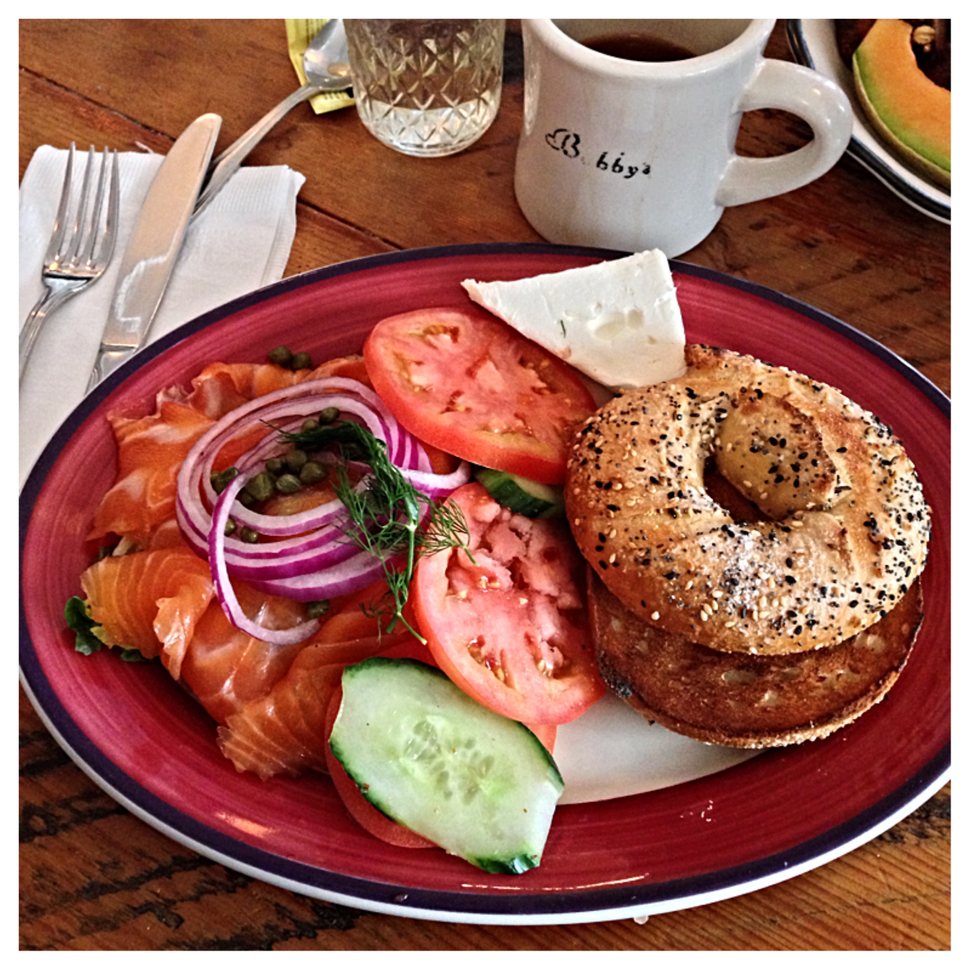 I’m somewhat a creature of habit when it comes to my brunch choices. I love a good egg dish and an amazing smoked salmon platter, so, I went for the latter (what’s up, Dr. Seuss). I got their Smoked Organic Salmon Platter (cucumbers, red onions, tomatoes, capers, cream cheese, homemade bagel). Served on a crisp bed of lettuce, the generous portion of salmon is fresh and delicious. Whether you sandwich it up or eat separately as a smoked salmon salad and bagel with cream cheese, all the flavors go so well together. The homemade everything bagel I chose was perfectly toasted, crunchy on the outside and warm and soft on the inside.