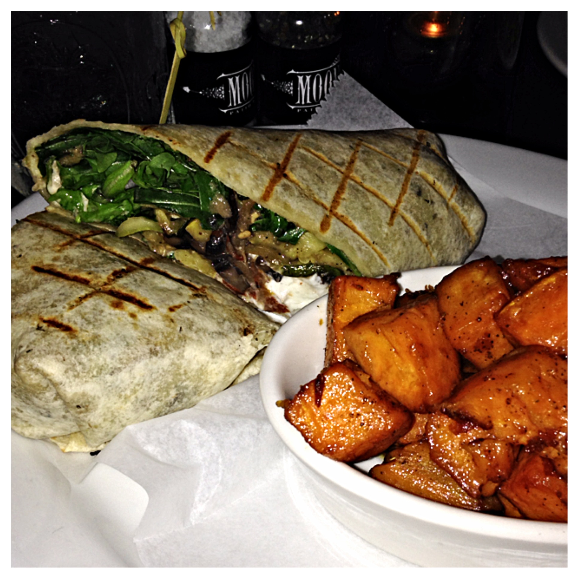 I ordered The Bohemian (Portobello, Grilled Zucchini, Red Bell Pepper, Red Onion, Arugula, Goat Cheese and Eggplant Spread wrapped in a Herb Tortilla). You choose a side dish and I went with Roasted Sweet Potatoes with Rosemary Oil. The wrap was delicious and hearty. The portobello mushrooms are juicy, and complimented by the crunch of the greens, the caramelized veggies and the creaminess of the rich goat cheese. The sweet potatoes are amazing, they’re tender, well seasoned and naturally sweet.