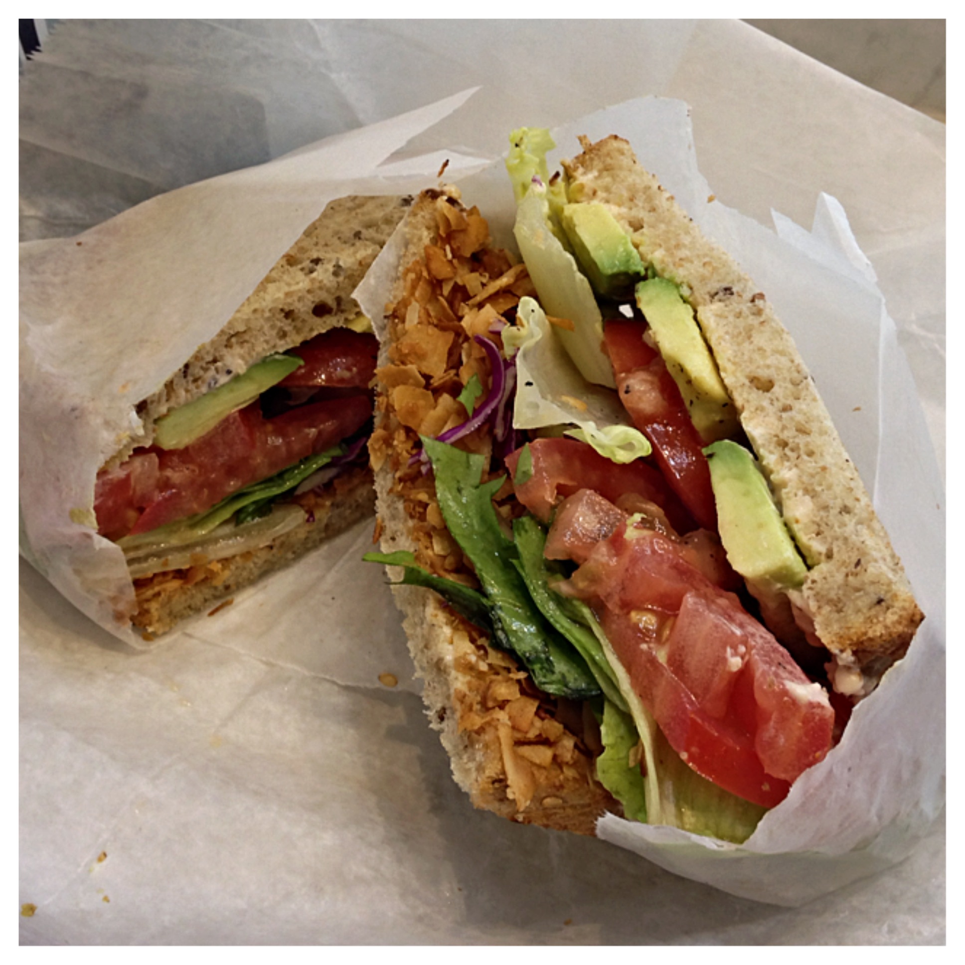I ordered their Coconut Bacon Sandwich (applewood-smoked coconut “bacon”, avocado, tomato, house greens, house made vegan mayo, seven grain bread), which is actually vegan. I’m not vegan, but it sounded healthy and delicious…and it was. The lettuce is fresh, crisp, and the tomato juicy. Then, you have the little “bacon” bits which are similar to the texture of chips with a smoky, sweet, and coconutty flavor. The creaminess of the avocado and the sweet herbiness of the spread compliment the sandwich really nicely.