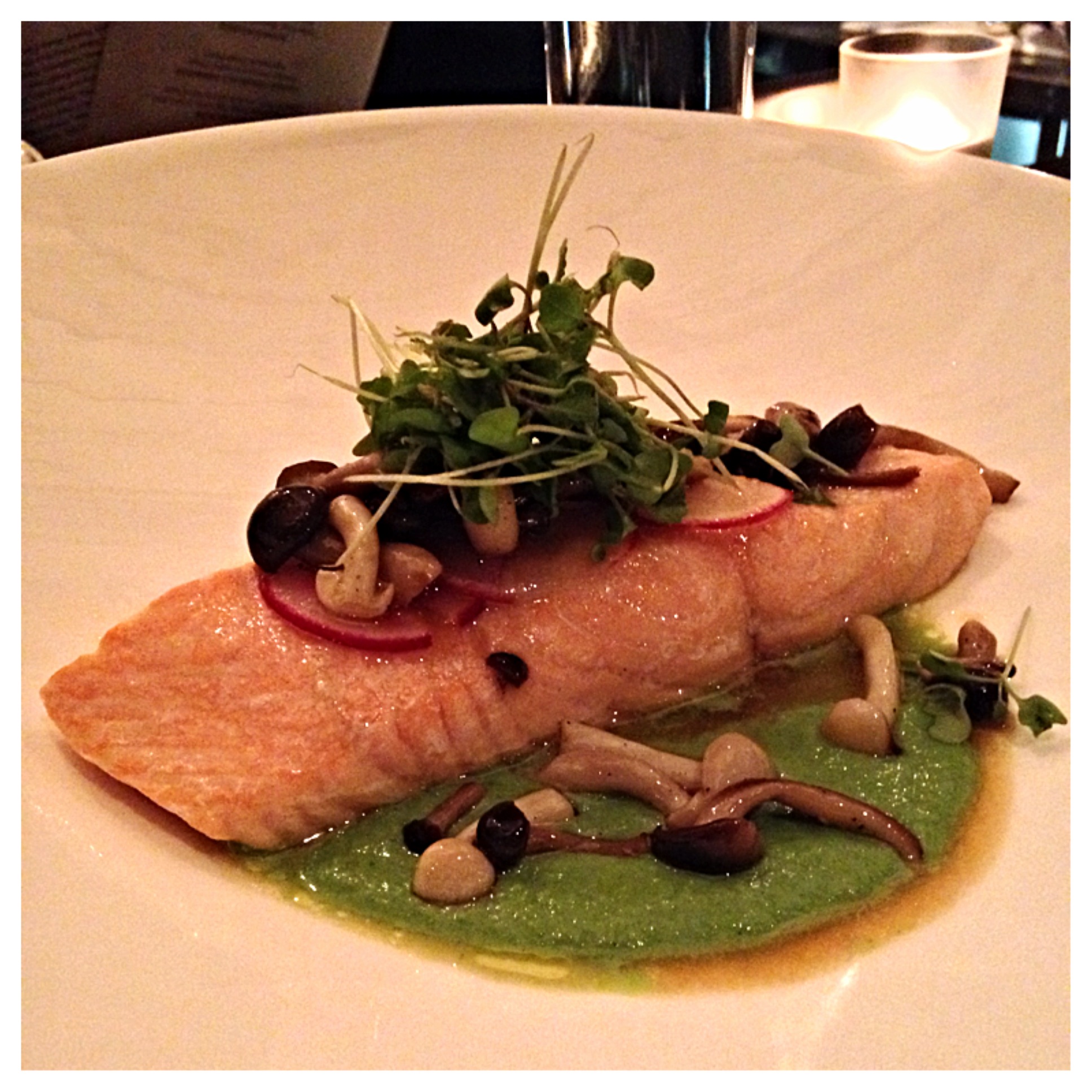 I ordered the Slow Roasted Skuna Bay Salmon (Edamame Puree, Roasted Hon Shimeji mushrooms, Radish, Wasabi Greens, Soy Ginger Vinaigrette). I really thought this was a great dish. The salmon was perfectly cooked to my request of medium rare, it was light, tender, and when mixed with the soy ginger vinaigrette, it soaks up a really wonderful flavor. The mushrooms were little morsels of perfection, and the edamame puree was a smooth and creamy component that just really tied the whole dish together.