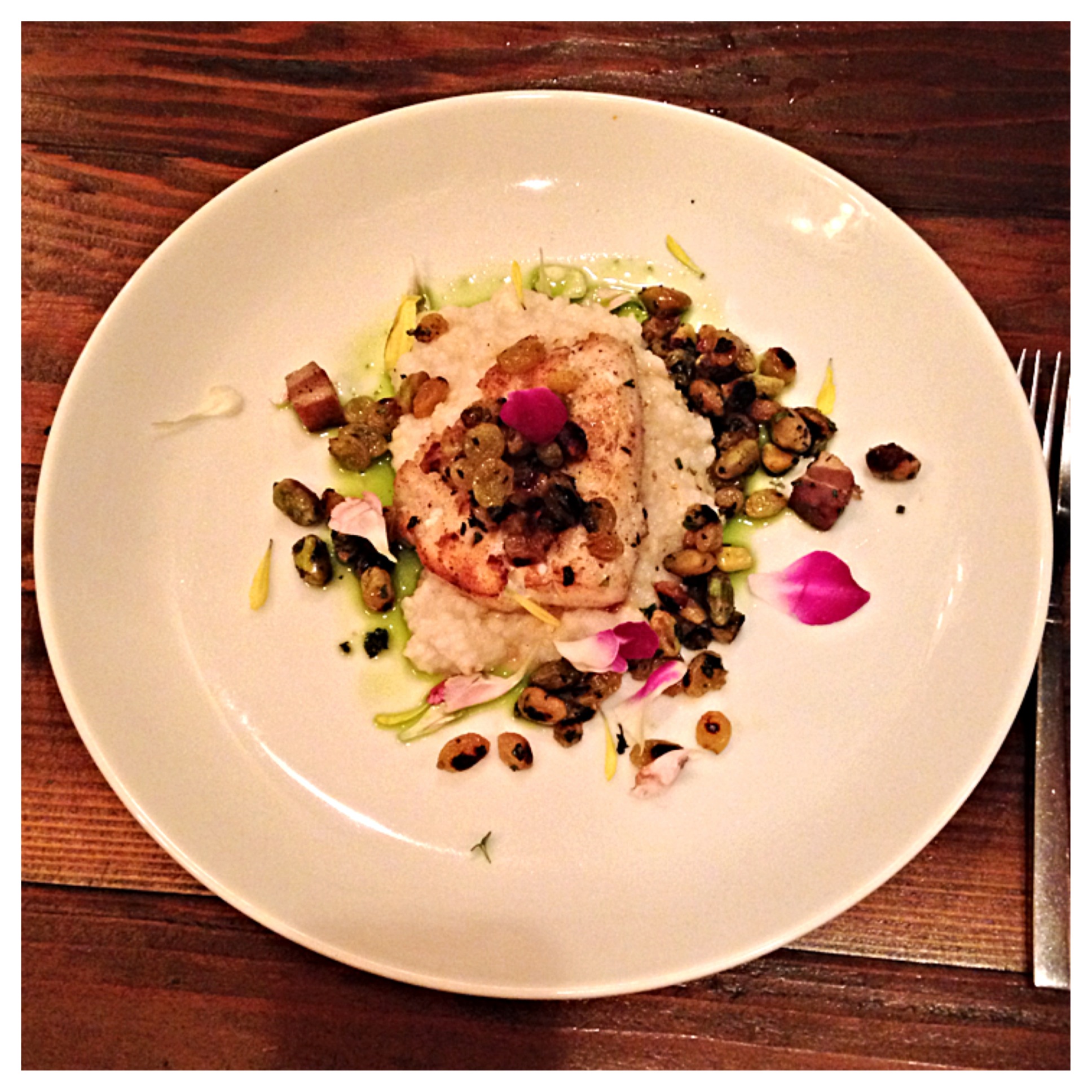 For my entree, I had the Pan Seared Grouper (Meyer Lemon grits, braised pistachios, braised white raisins). I really loved this. This fish was tender, flavorful, and set atop of the creamy grits. I’ve never had citrusy grits, and I really liked them. The flavor cuts some of the richness and almost keeps it on the lighter side. The braised pistachios and raisins add a really nice, sweetened, crunch and texture contrast to the delicate fish and creaminess of the grits.