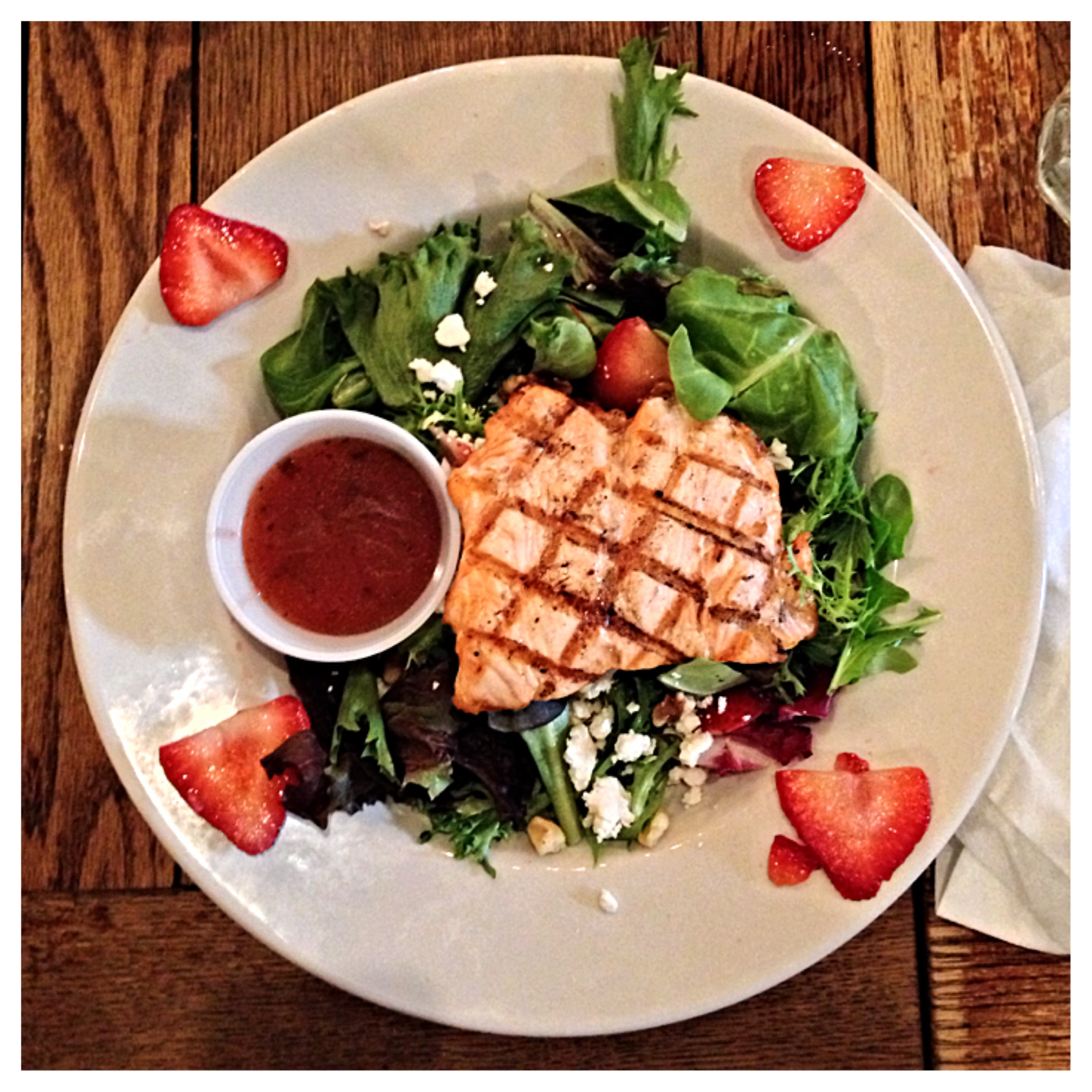 Ok, so, I know it’s isn’t quintessential Southern food, but it sounded really delightful to me, so, I went for it. I ordered their most popular salad, Strawberry Field Salad with Grilled Salmon (mixed greens topped with strawberries, feta, walnuts and raspberry vinaigrette). I really liked this salad, it was light, fresh, and any salad with a killer fruit/nut/cheese combo is a real bonus.