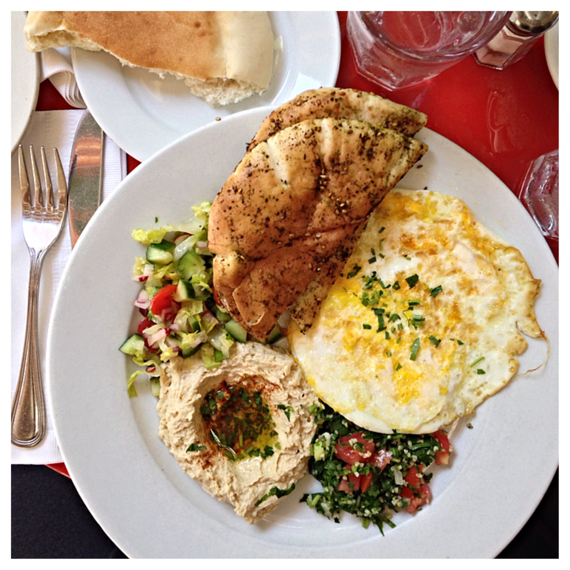 Breakfast is known as the most important meal of the day, and they’re serving it until 4pm. I love breakfast food, so I had to take advantage. I ordered the Middle Eastern Eggs (two eggs any style with hummus, tabouli, salad and zahatar pita). I love this type of meal, it’s fresh, healthy, and substantial. Each component was delicious, the salad is chopped, with a really nice zesty citrus and oil dressing. You can really taste the fresh parsley flavor in the tabouli, and their hummus is creamy and flavorful. The zahatar pita is also amazing, served warm and pillowy with the amazing Moroccan spices.