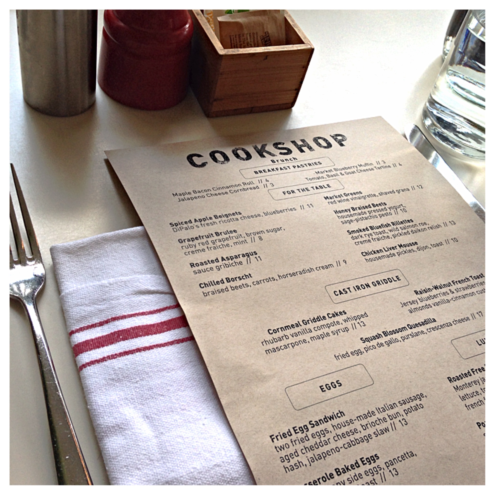 This past weekend, I had brunch at Cookshop in Chelsea. With summer weather here, whether you sit outside at their outdoor patio, or inside in the airy, open, modern dining room, your experience will all pretty much be the same. Amazing. Their American cuisine is focused on humanely raised animals, support of local farmers and artisans, and seasonal availability of foods.