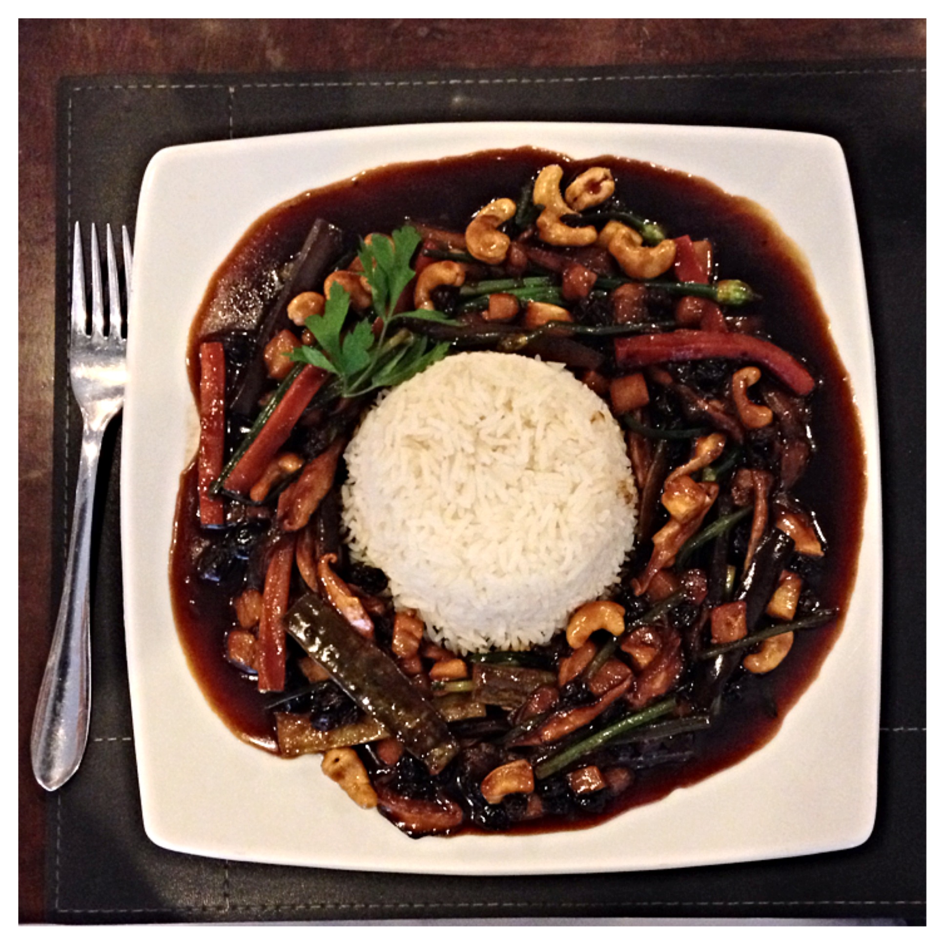 Then for my entree, I ordered Phat Ma Maung Him Ma Pan (braised shiitake mushrooms and vegetables in a mild sauce, covered with toasted cashew nuts, pineapple cubes and coriander with jasmine rice). I really liked this dish a lot. It was different from other stir fries that I’ve had, this one on the sweet side with a really nice glaze. The veggies were really bountiful, I loved the crunch from the cashews, and I especially liked the raisins that also added that natural sweetness.