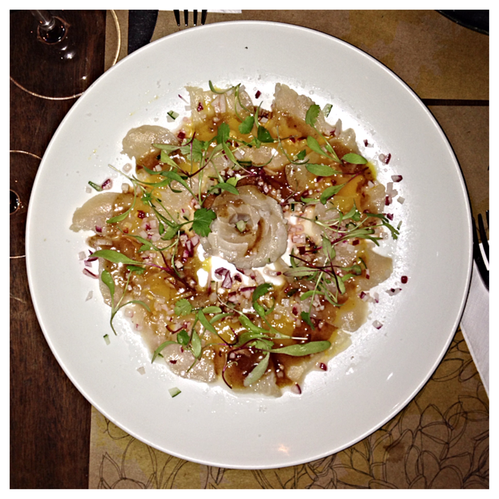 We started off with a nice bottle of Rose, and I ordered a couple of appetizers as a meal. First, I had the Mahi-Mahi Sashimi (tamarind, passionfruit, cucumber, radish, dill, sprouts). This was really great, the fish tasted fresh, and I really like the accompanying components, a bit of sweet and crunch to mix up the texture.