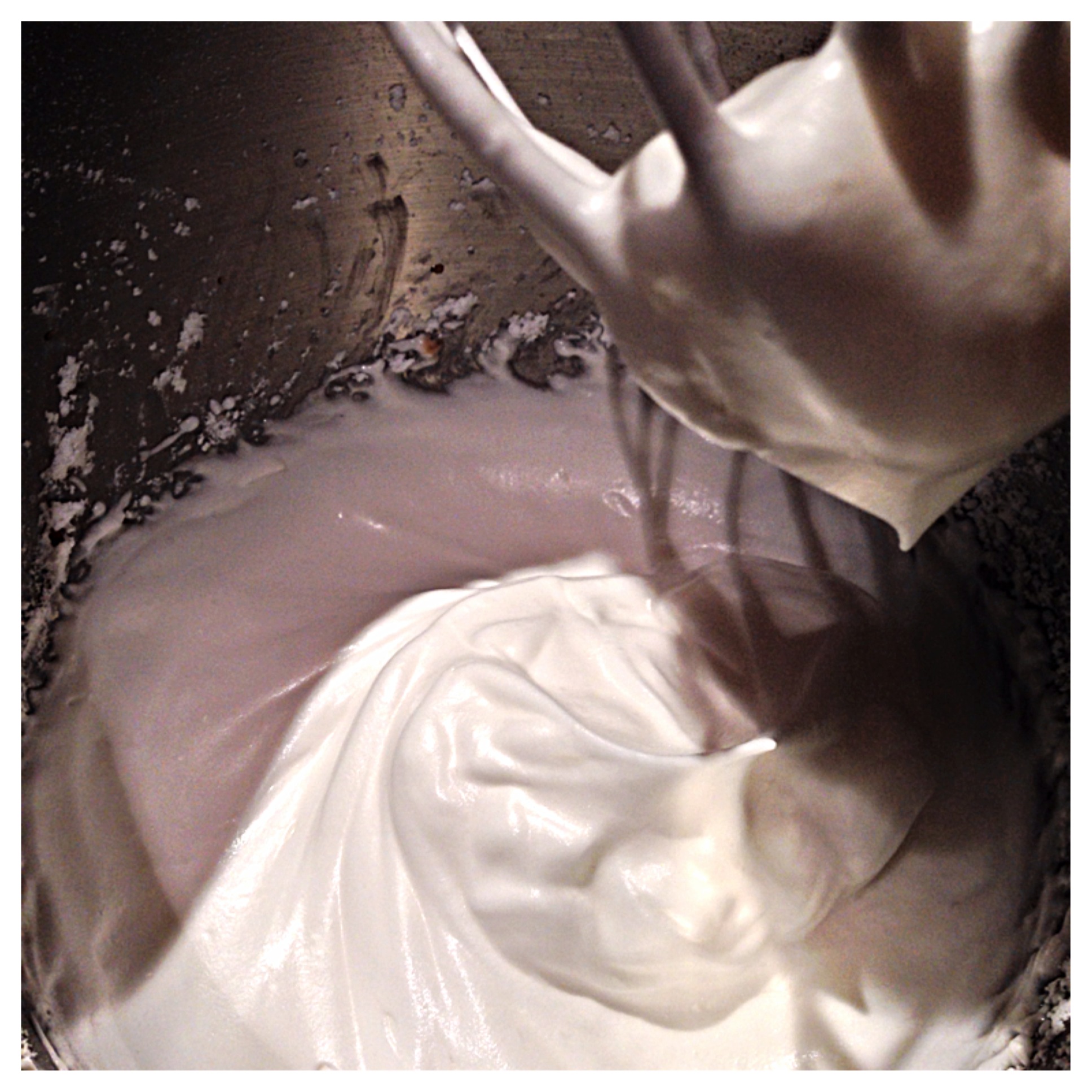 Then, slowly add in about half of the sugar until the mixture forms pillowy peaks. Then, slowly add the rest of the sugar, folding it in.